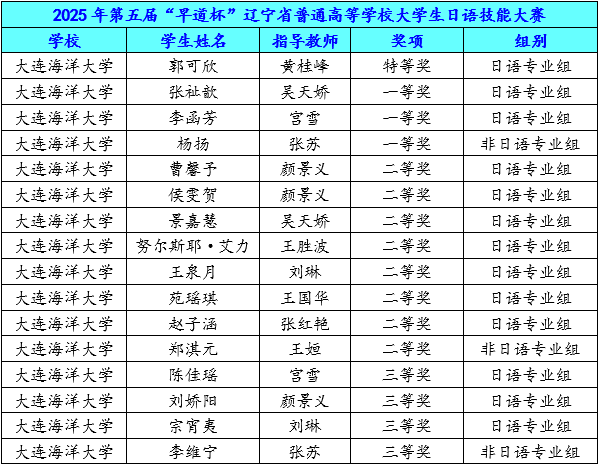 11月14日,由辽宁省教育厅主办、大连外国语大学承办的2025年第五届“早道杯”辽宁省大学生日语技能大赛落下帷幕。经过预赛日语作文、日语笔译及决赛日语演讲的多轮角逐,我校共16名学生获三等奖及以上奖项。
