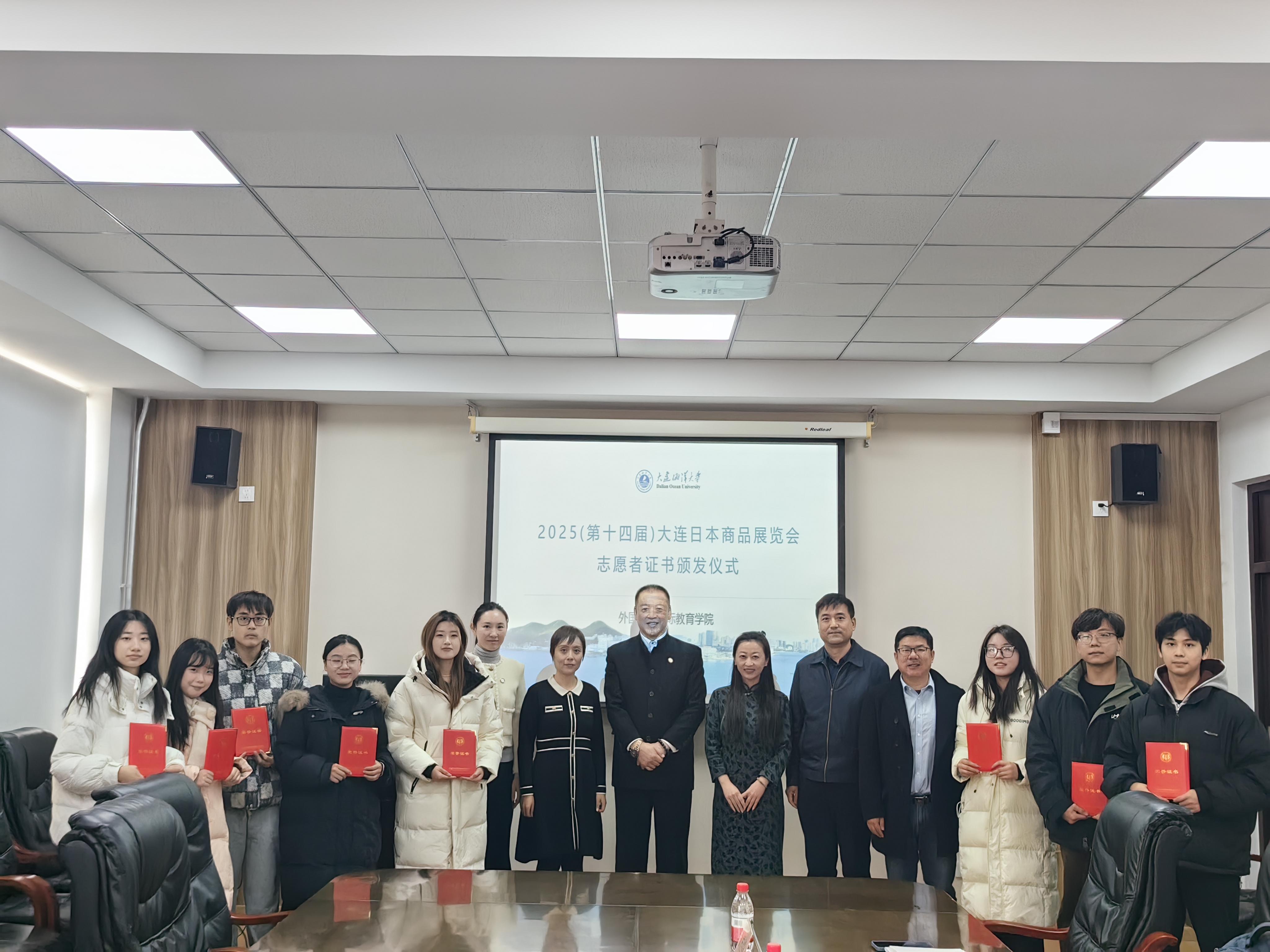1117日,外国语与国际教育学院与大连市中日经济合作交流协会在北院S520会议室举办2025(第十四届)大连日本商品展览会志愿者表彰暨座谈交流会。大连市中日经济合作交流协会会长徐朝法、秘书长韩翔然,外国语与国际教育学院院长张宁光、党委书记王海鹏、副院长张苏、纪委书记黄桂峰出席活动,参与展览会服务的研究生志愿者参加会议