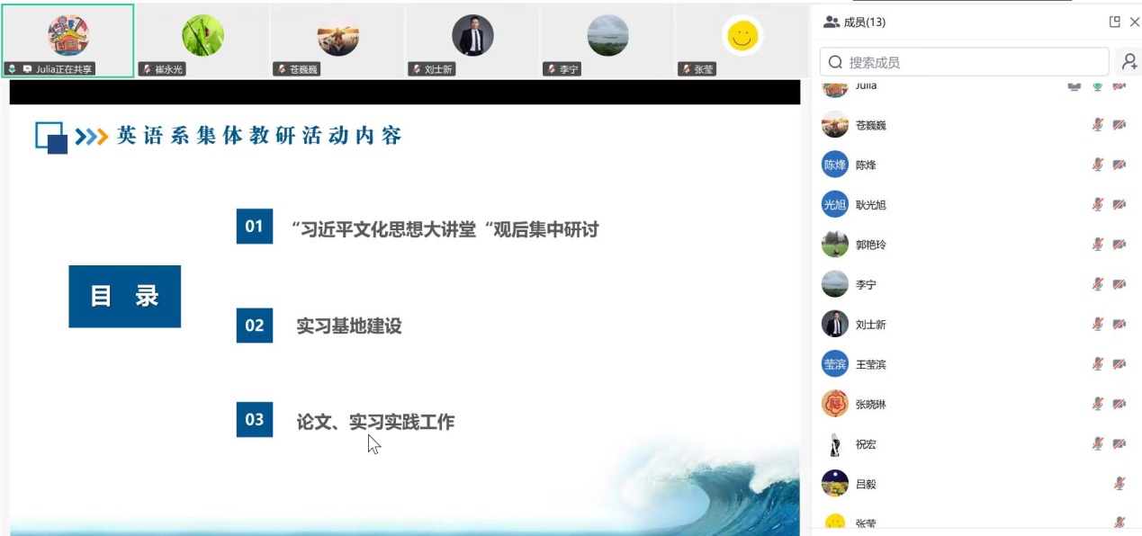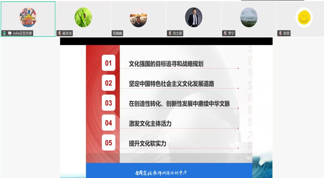近期,英语系组织全体教师观看了“习近平文化思想大讲堂”系列讲座,认真学习了习近平文化思想,并于1125日开展了线上集体研讨活动,大家反馈受益匪浅。习近平文化思想是新时代中国特色社会主义文化建设的科学指南和根本遵循,系统回答了新时代文化建设举什么旗、走什么路、坚持什么原则、实现什么目标等根本问题。通过学习《习近平文化思想学习纲要》,教师们对建设文化强国的重大意义、实践路径和使命担当有了更深刻认识。