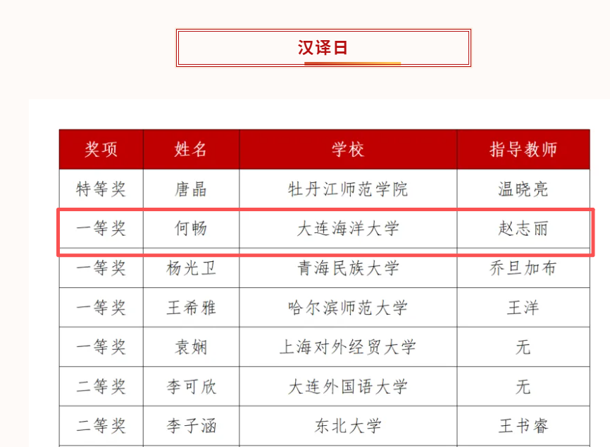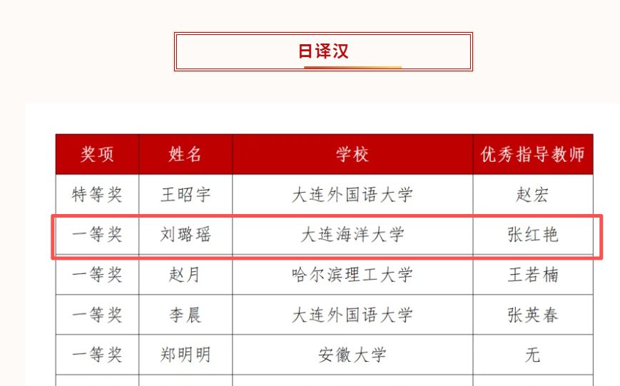 在英语类翻译竞赛中,杨宇超同学在张艺玲老师的指导下,荣获英语组英译汉项目特等奖,以该组第1名的优异成绩摘得桂冠;张恩泽同学获得英译汉二等奖,任良玉和魏晴晴同学均获得英译汉三等奖,邢惠媛同学获得汉译英三等奖。在日语类翻译竞赛中,刘璐瑶同学获得日译汉组一等奖(该组第2名),何畅同学获得汉译日组一等奖(该组第2名),高明慧同学获得日译汉组三等奖。