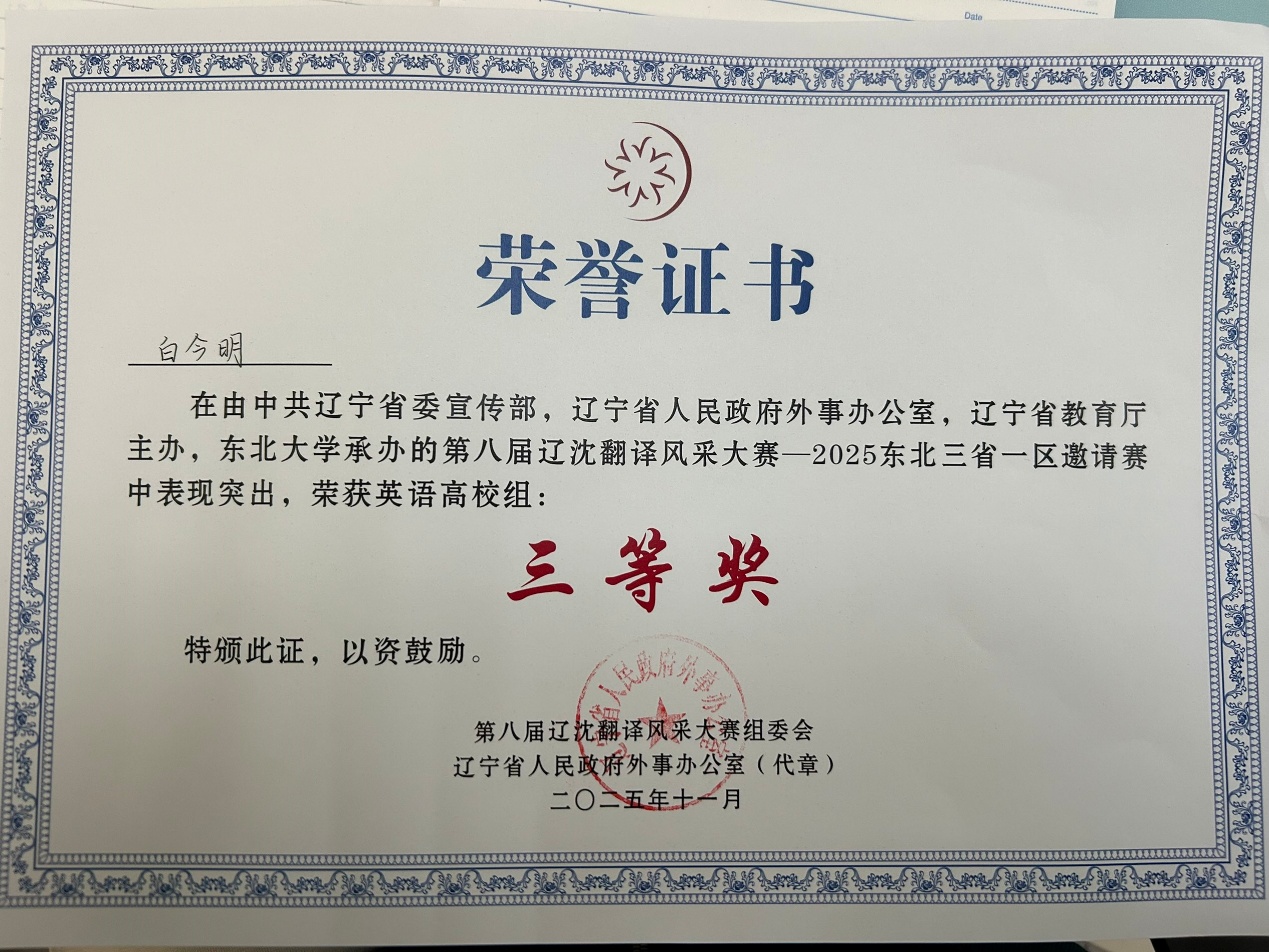 近日,第八届辽沈翻译风采大赛——2025东北三省一区邀请赛决赛及颁奖典礼在沈阳落下帷幕。外国语与国际教育学院2023级英语笔译研究生白今明(指导教师李明秋教授)最终取得高校英语组决赛三等奖,在口译实战中展现了我院学子的卓越风采。