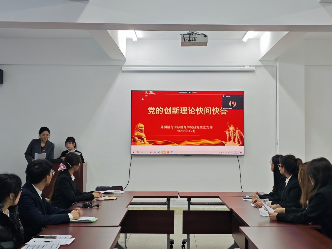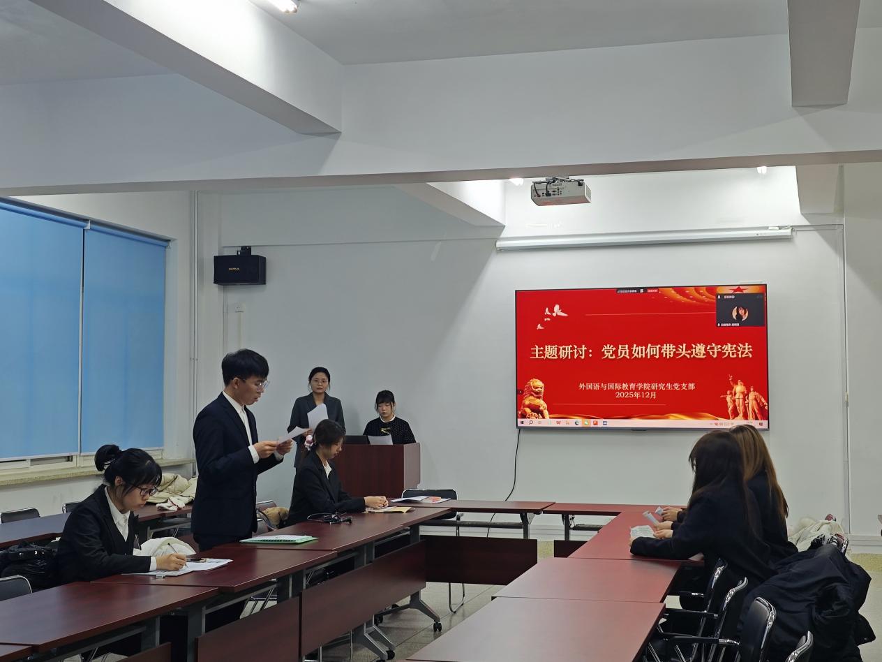 为持续深化理论学习,强化党员意识,增强法治观念,12月8日,外国语与国际教育学院研究生党支部以线上线下相结合的形式,组织开展了“学习宪法精神,践行党员担当”12月主题党日活动。活动由党支部书记刘家馨主持,支部全体党员参加。