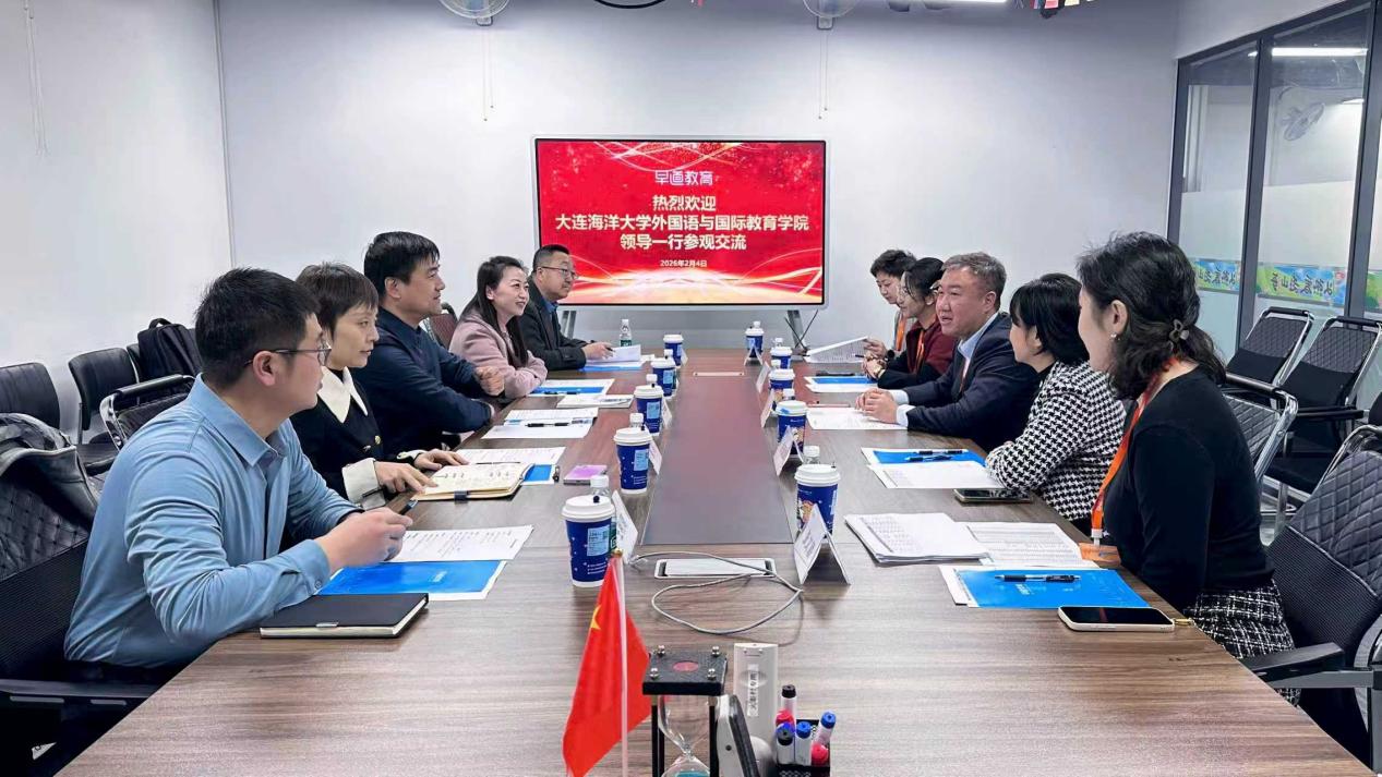 2026年2月4日上午,大连海洋大学外国语与国际教育学院班子成员,赴大连高新区早道外语教育培训学校有限公司开展访企拓岗专项行动。双方就人才培养、实习实践、就业对接等方面进行了深入交流,并达成多项合作意向。