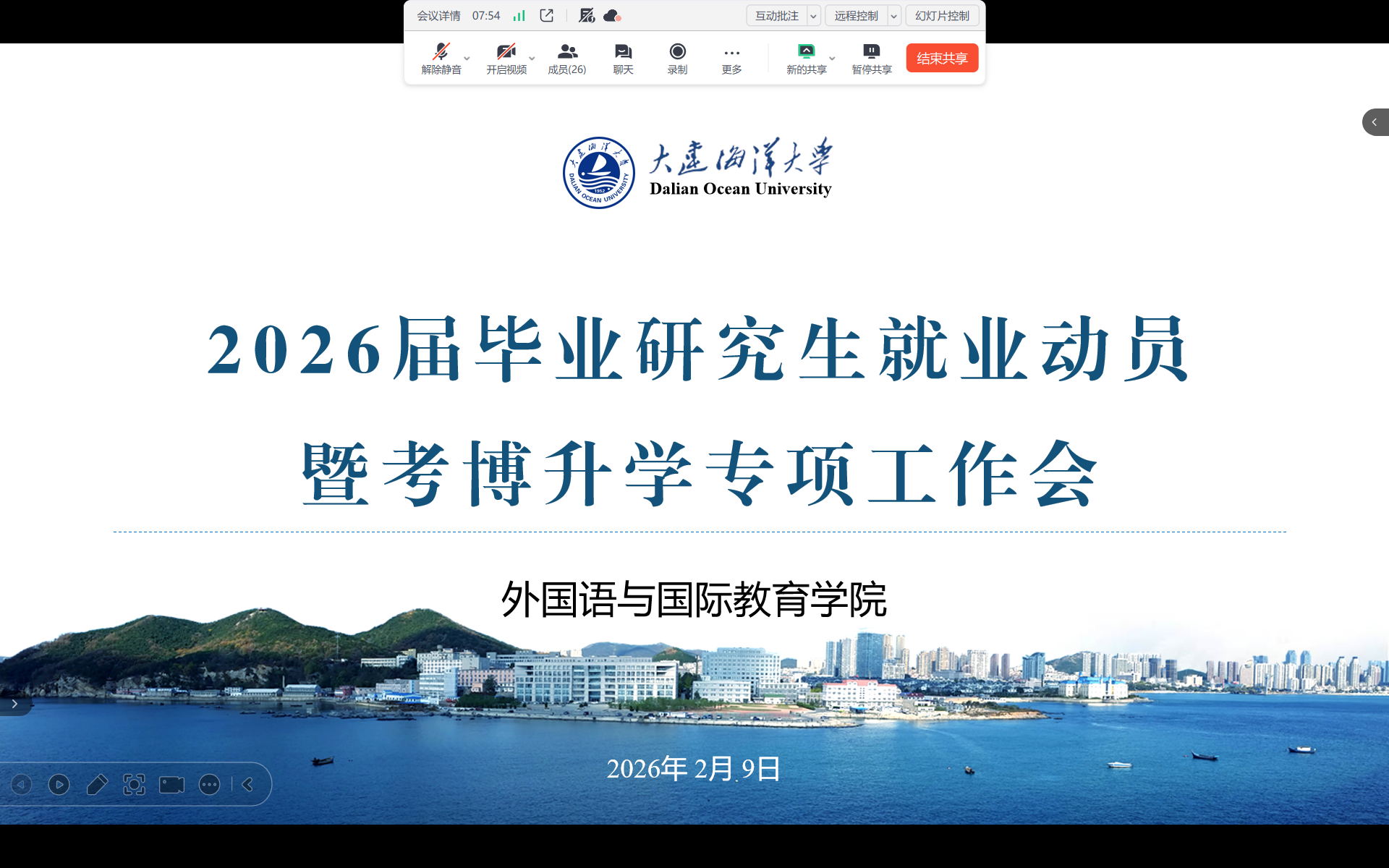 2026年2月9日,外国语与国际教育学院通过线上腾讯会议平台,组织召开了2026届毕业研究生就业动员及考博升学专项工作会。学院领导班子成员、研究生辅导员、全体研究生导师等参加会议。会议由学院纪委书记黄桂峰主持。