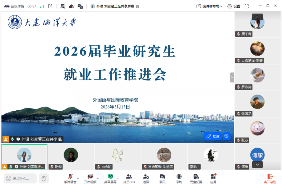 为切实推进2026届毕业研究生学业与就业工作有序开展,帮助同学们明确毕业要求、理清就业思路,3月13日,外国语与国际教育学院以腾讯会议形式召开2026届毕业研究生就业工作推进会。学院纪委书记黄桂峰、副院长张苏、辅导员刘家馨及全体2023级研究生参加会议,会议由刘家馨主持。