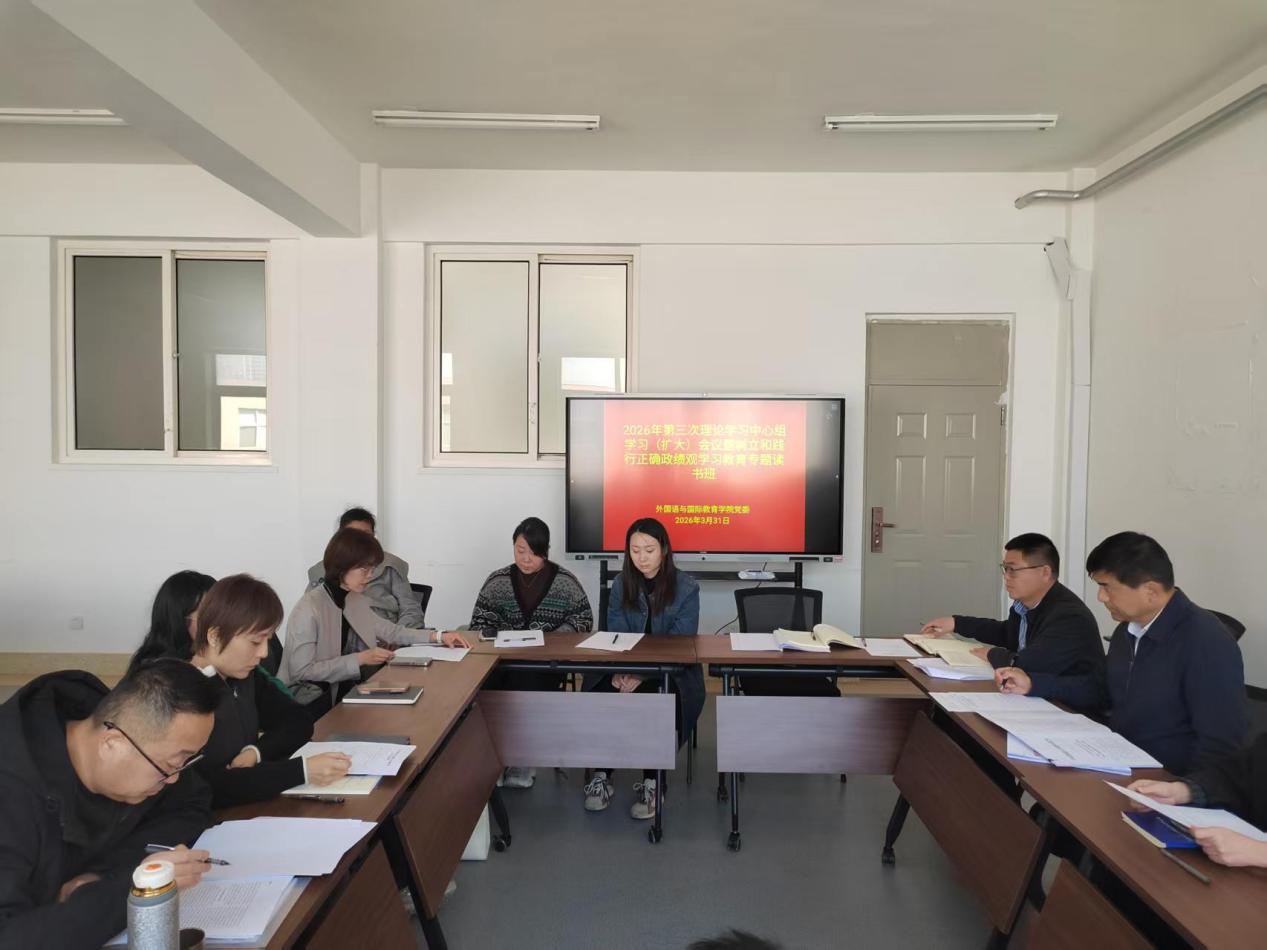 3月31日,外国语与国际教育学院党委在会议室召开2026年第三次理论学习中心组学习(扩大)会议暨树立和践行正确政绩观学习教育专题读书班。学院党委理论学习中心组全体成员、各系主任及副主任、各支部委员、科级以上党员干部参加学习。会议由学院党委书记王海鹏主持。